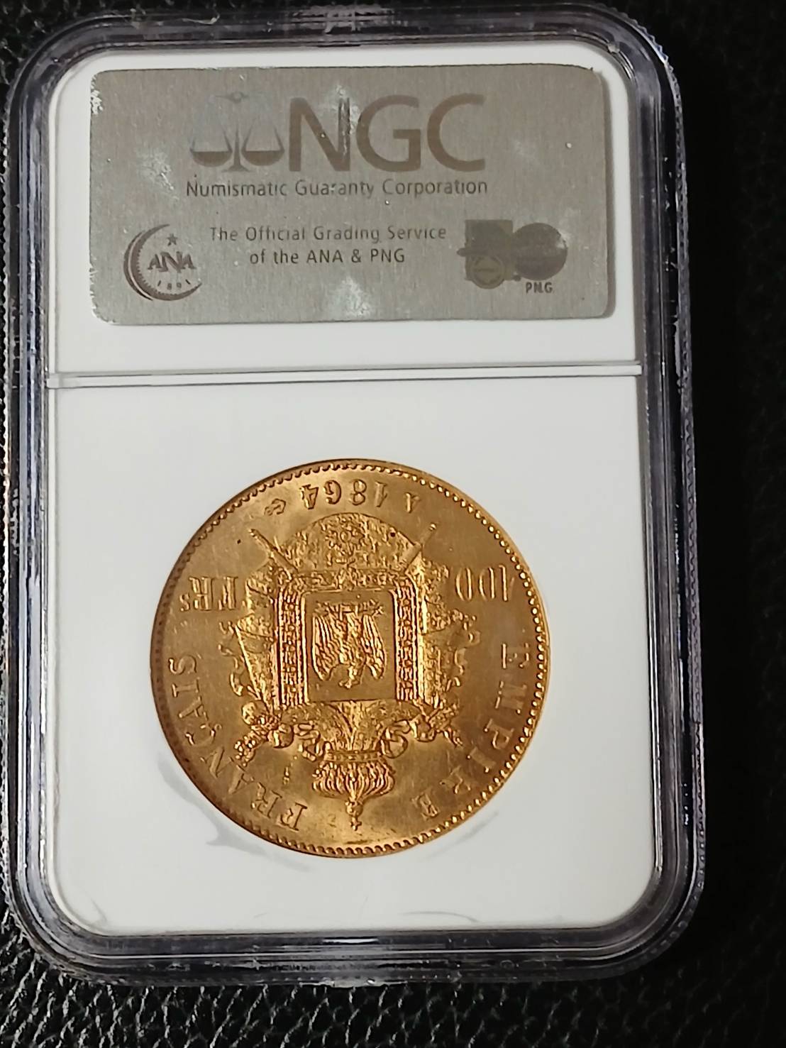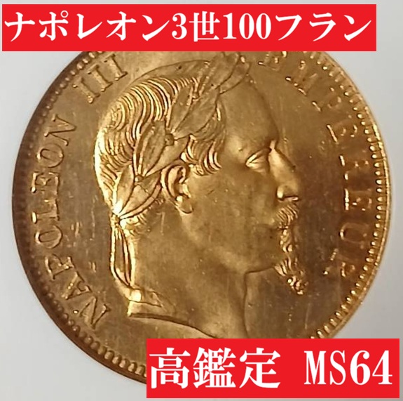 1864年パリ鋳造のナポレオン3世100フラン金貨 MS64になります。