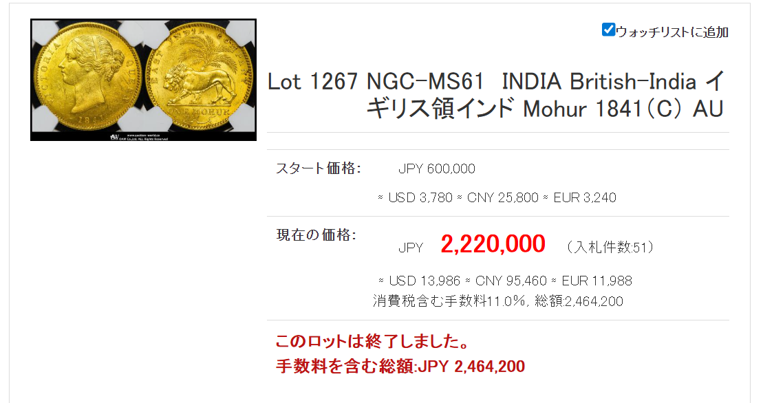 1841年ビクトリアモハールMS61 246万円