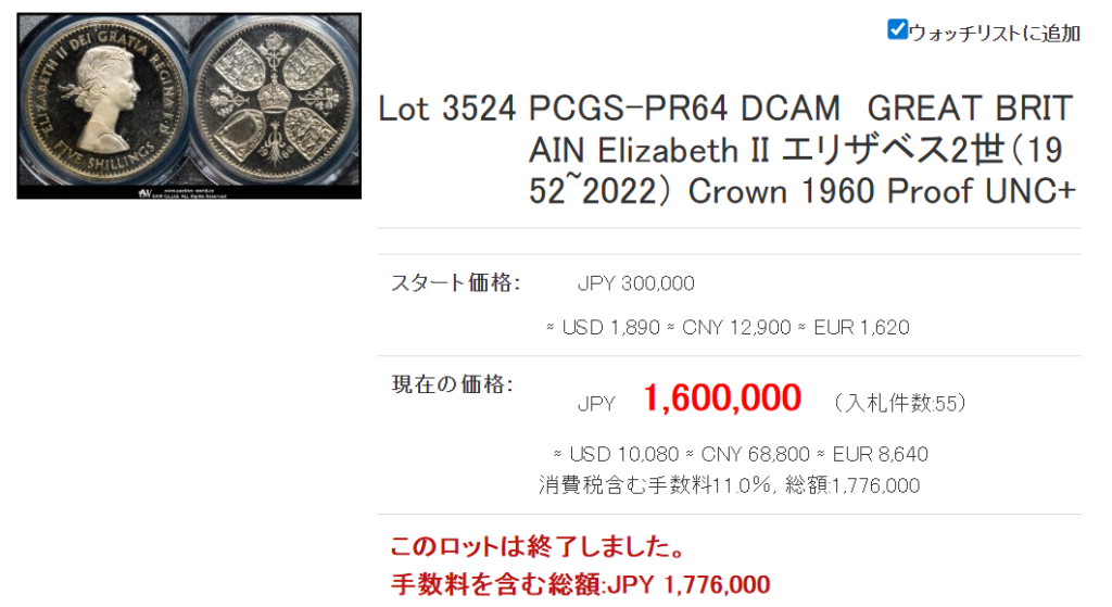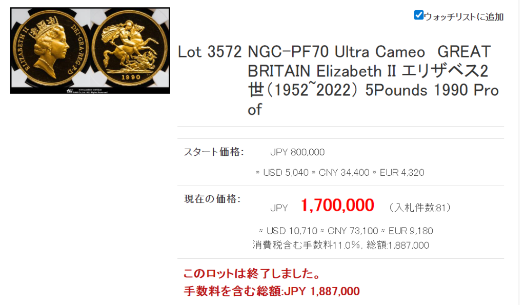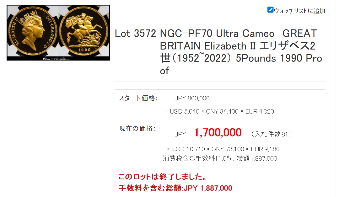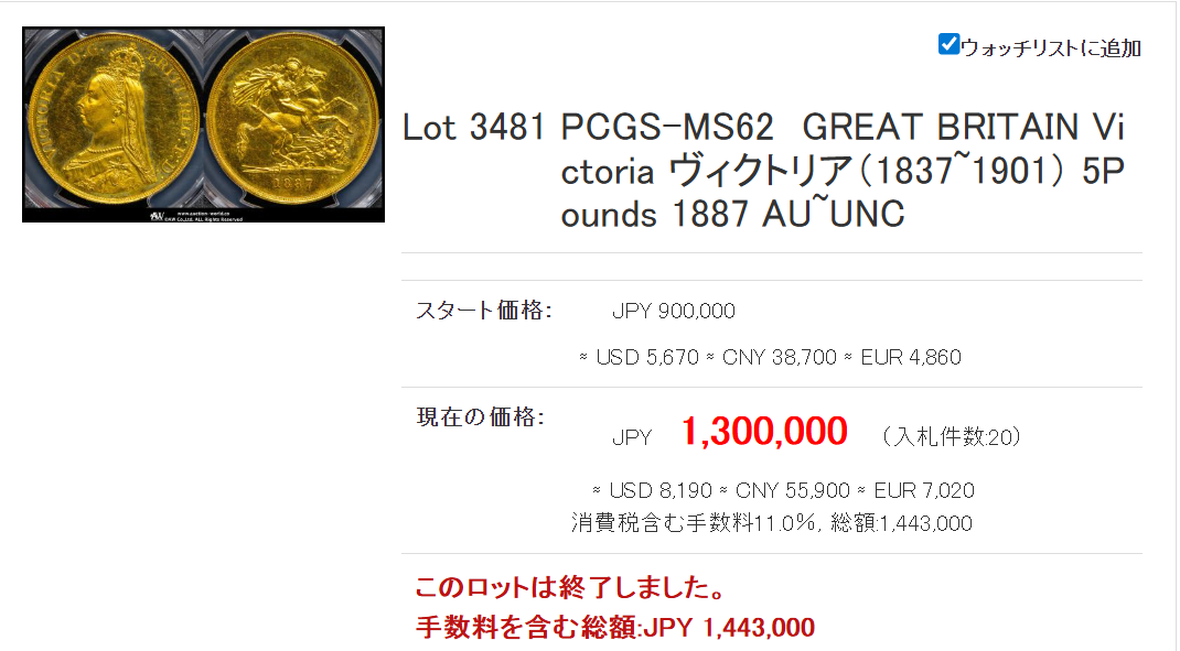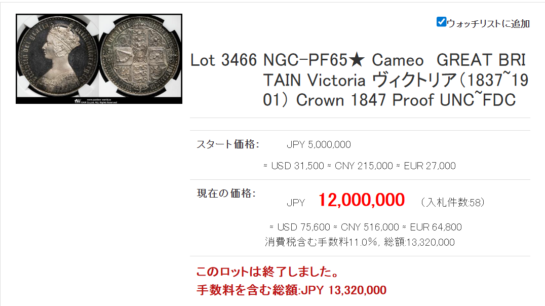 相変わらずの強さを誇るビクトリア女王!ジュビリーはMS62で144万円でした。少し前のMS63の価格ですから、これもかなり伸びてきましたね!