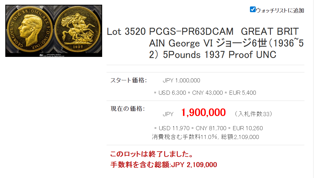 ジョージ6世は完全復活からの高値更新です!一時期低迷していましたが、PR63DCで何と200万を軽く超えました!こちらも1段階上がりましたね!