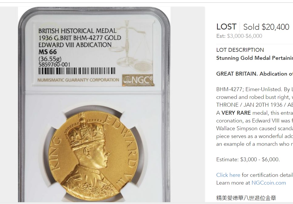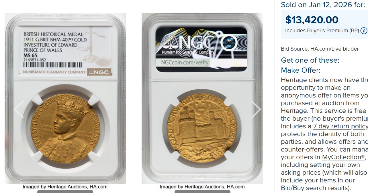 こちらは1911年にエドワード8世が皇太子に任命された際の記念メダルになります。金メダルの発行枚数はわずか129枚、同時に銀メダルも発行されており、こちらはたまに見ることがありますが、ゴールドの方が市場に出てくることはほぼありません。