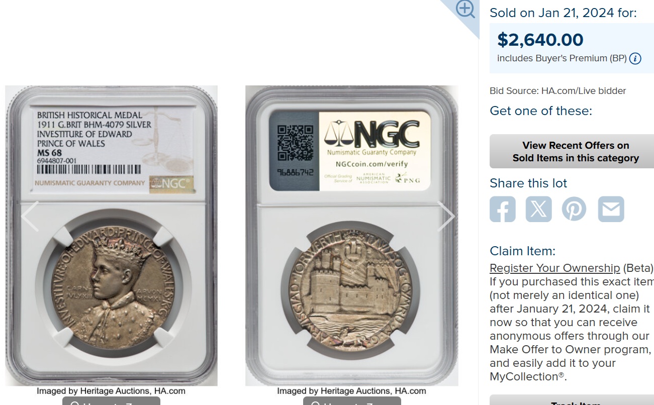 1911年幻のエドワード8世皇太子記念メダル【MS65】