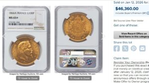 2026年1月に1866A(9,041枚)のMS65+が790万円で(46,360$×1.1×@155円)落札