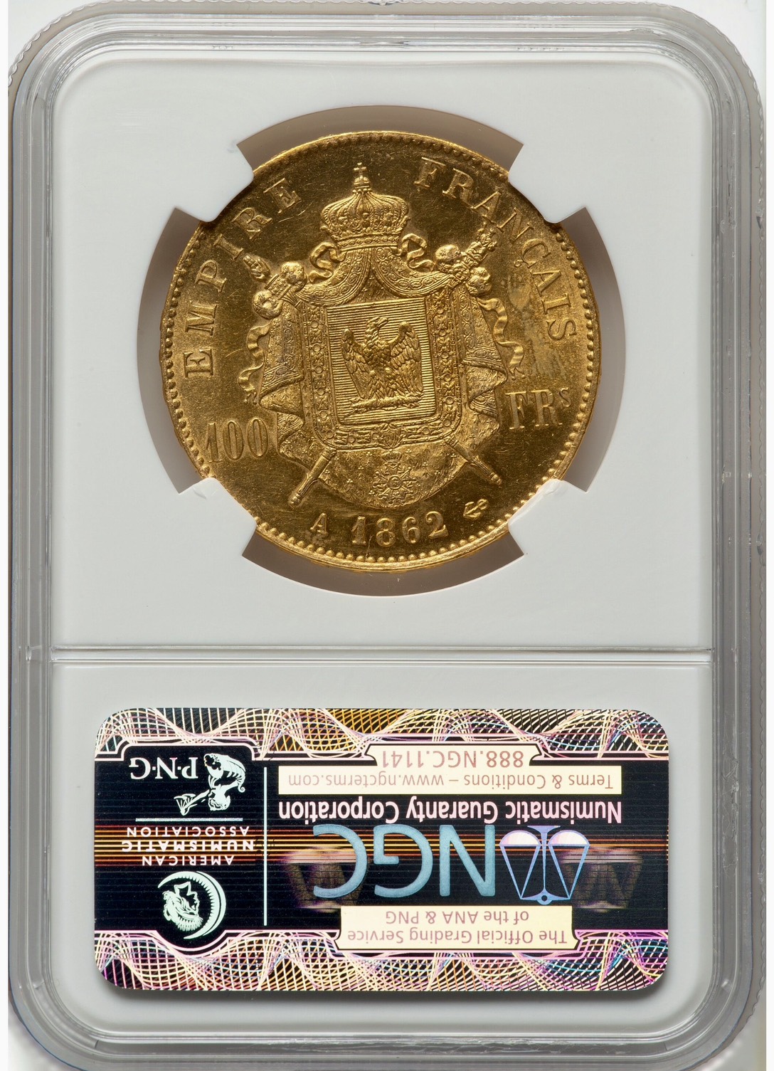 今回は1862年Aです。希少性に関してはナポレオン3世100フランの中では中位と言えます。