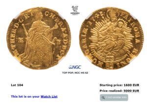 1756年 マリアテレジアのダカット金貨 ハイグレードのNGC MS62になります。