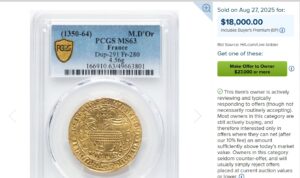 【参考】2025年8月に1ムートンのMS63が313万円(18,000$×1.1×@158円)で落札