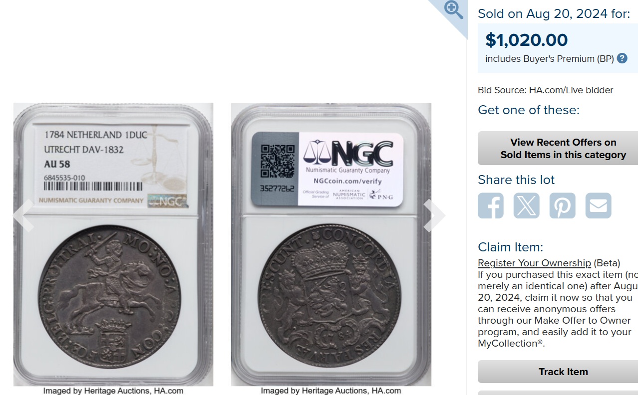 デゥカトーンも数年前と比べると随分上がりましたが、私はこれでもまだ安いと思っています。1700年代の大型のオランダコインがこの価格なのはどう考えても狙い目です。今後注目していきたいジャンルのひとつです。