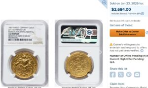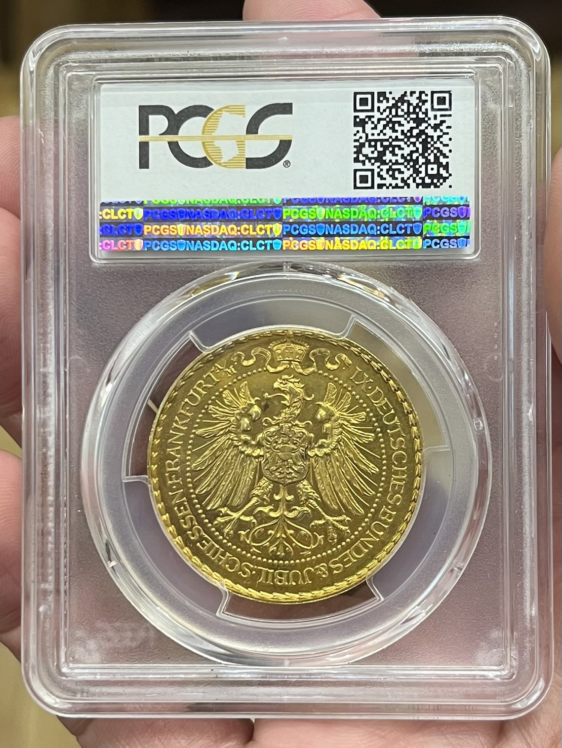 表面には甲冑をまとった騎士と、フランクフルトの紋章が描かれており、自由都市としての誇りや防衛力の象徴とされています。裏面はドイツ帝国の象徴である帝国鷲が描かれており、非常に重厚で精巧な1枚となっております。
