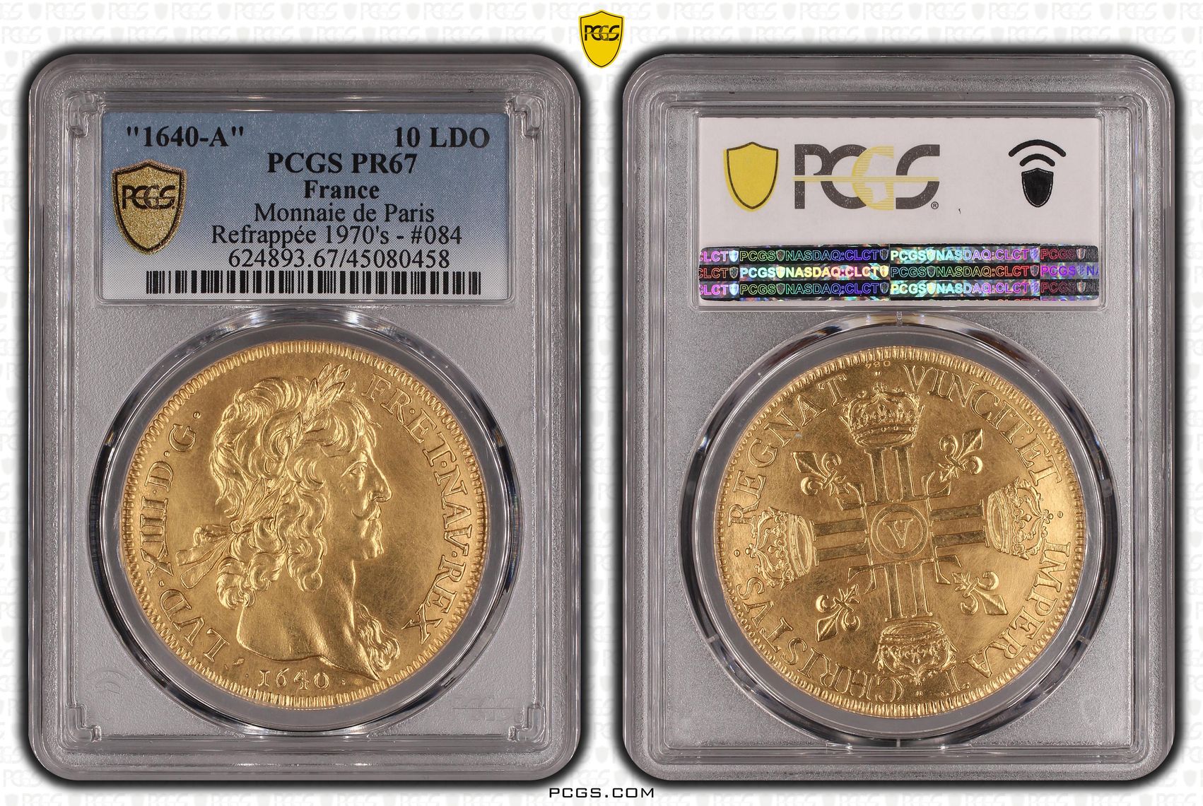 1640年フランス ルイ13世 10ルイドール金貨リストライク金貨、PCGS PR67というハイグレード品になります。