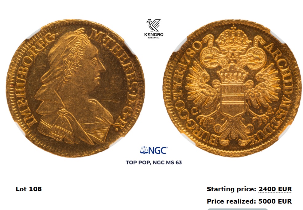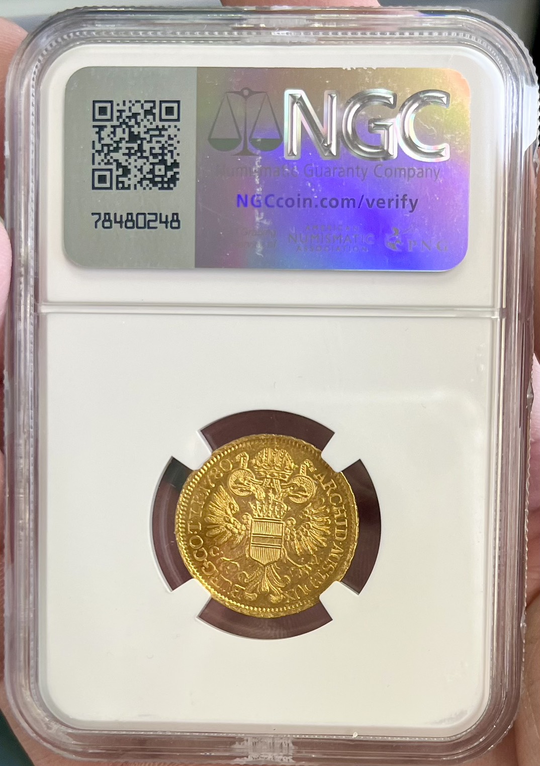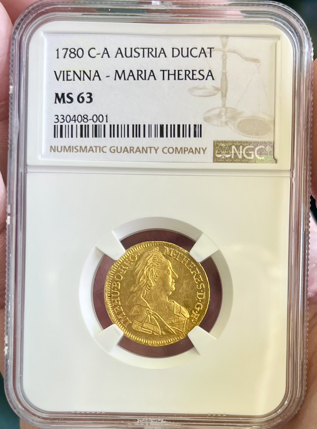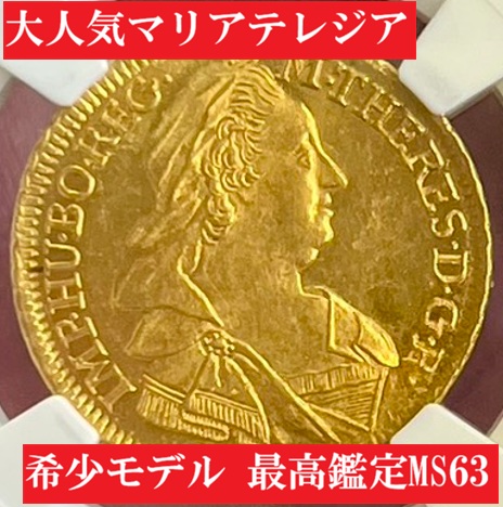 1780年 マリアテレジアのダカット金貨 ハイグレードのNGC MS63になります。こちらはよく出てくる立像のタイプではなく、喪服を纏ったマリアテレジアの希少タイプになります。
