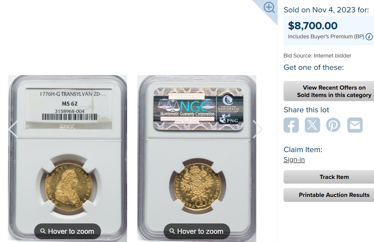 2023年11月に喪服2ダカットMS63が149万円で(8,700$×1.1×@156円)落札