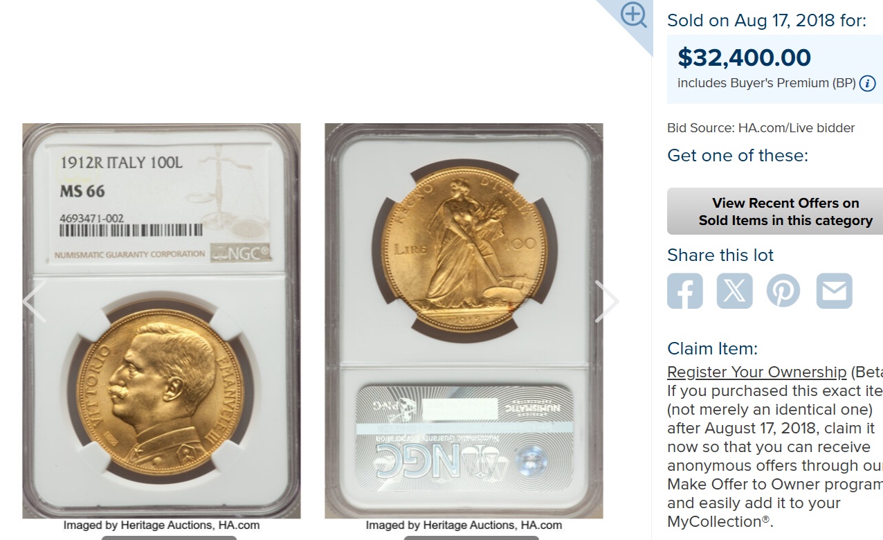 当店初登場!イタリアを代表するアンティークコイン、1912年「豊穣の女神」100リレ金貨、NGC MS65+の超ハイグレード品になります。