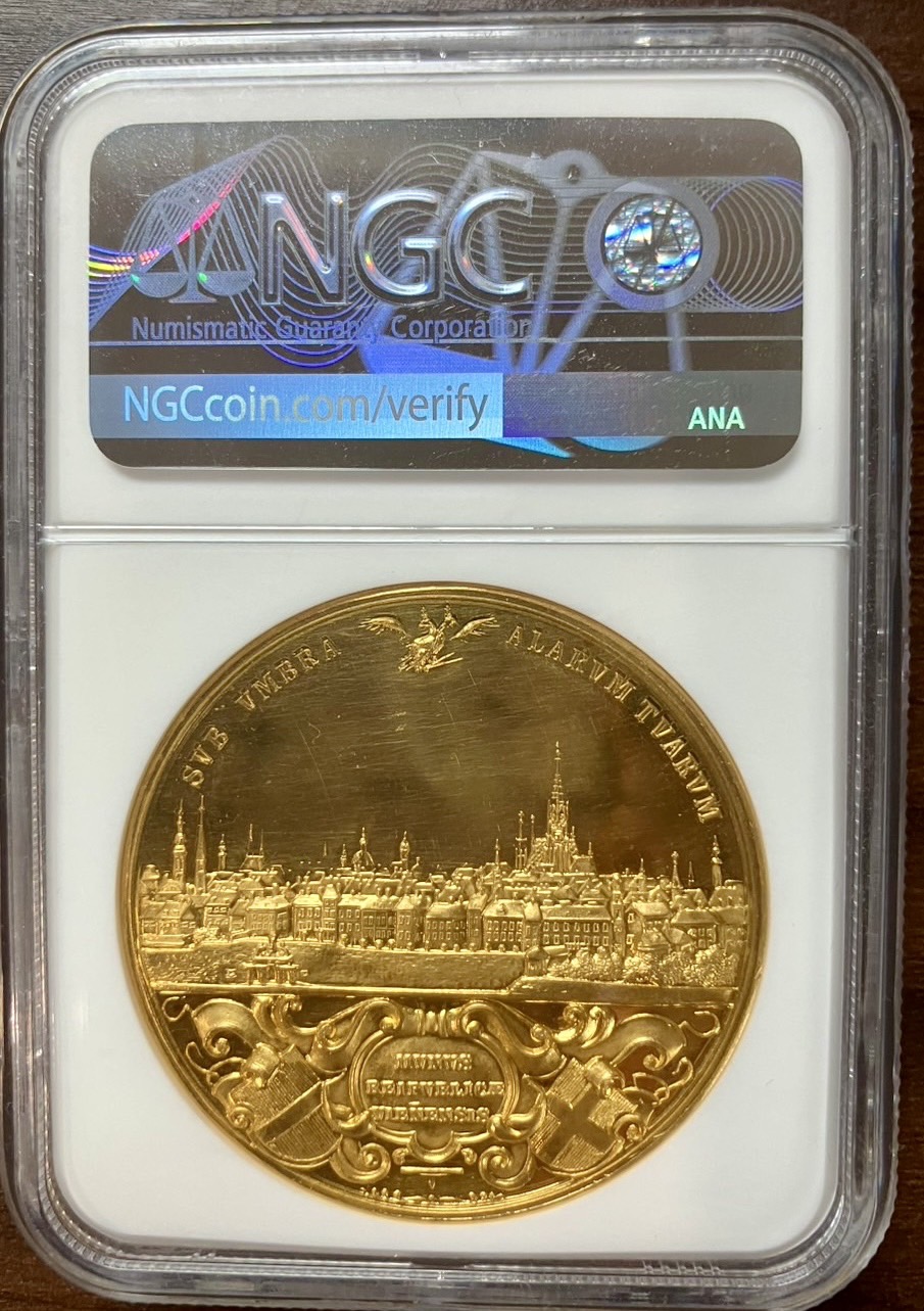 直径43 mm、重量41.86 gの12ダカット相当のゴールドメダルです。