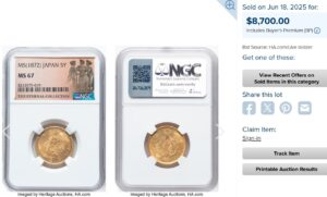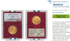 日本金貨に関しては、2023年に旧20円金貨を初めて紹介させて頂きましたが、その時はまだMS63で900万くらいでした。今はその値段では到底買うことは出来ない程価格が上がってしまいました。
