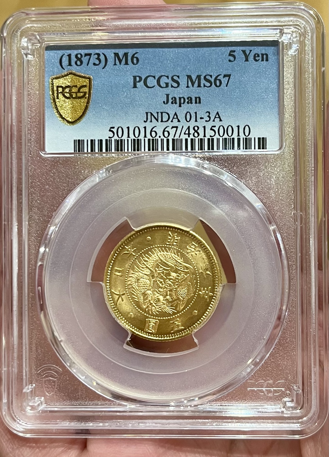 1873年、明治6年に発行された旧5円金貨、PCGS MS67の超ハイグレード品になります。
