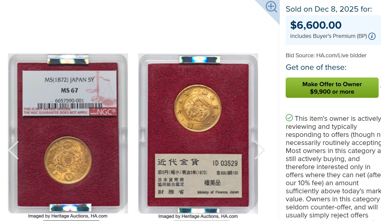 今回、MS67で110万円でのご案内となります。日本の金貨に関しては私よりも知識がある方も多いかと思いますので大それたことは言えませんが、オークションレコード以下の十分な価格帯ではないでしょうか。