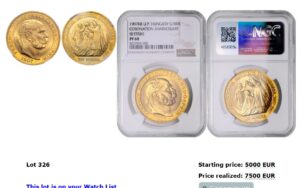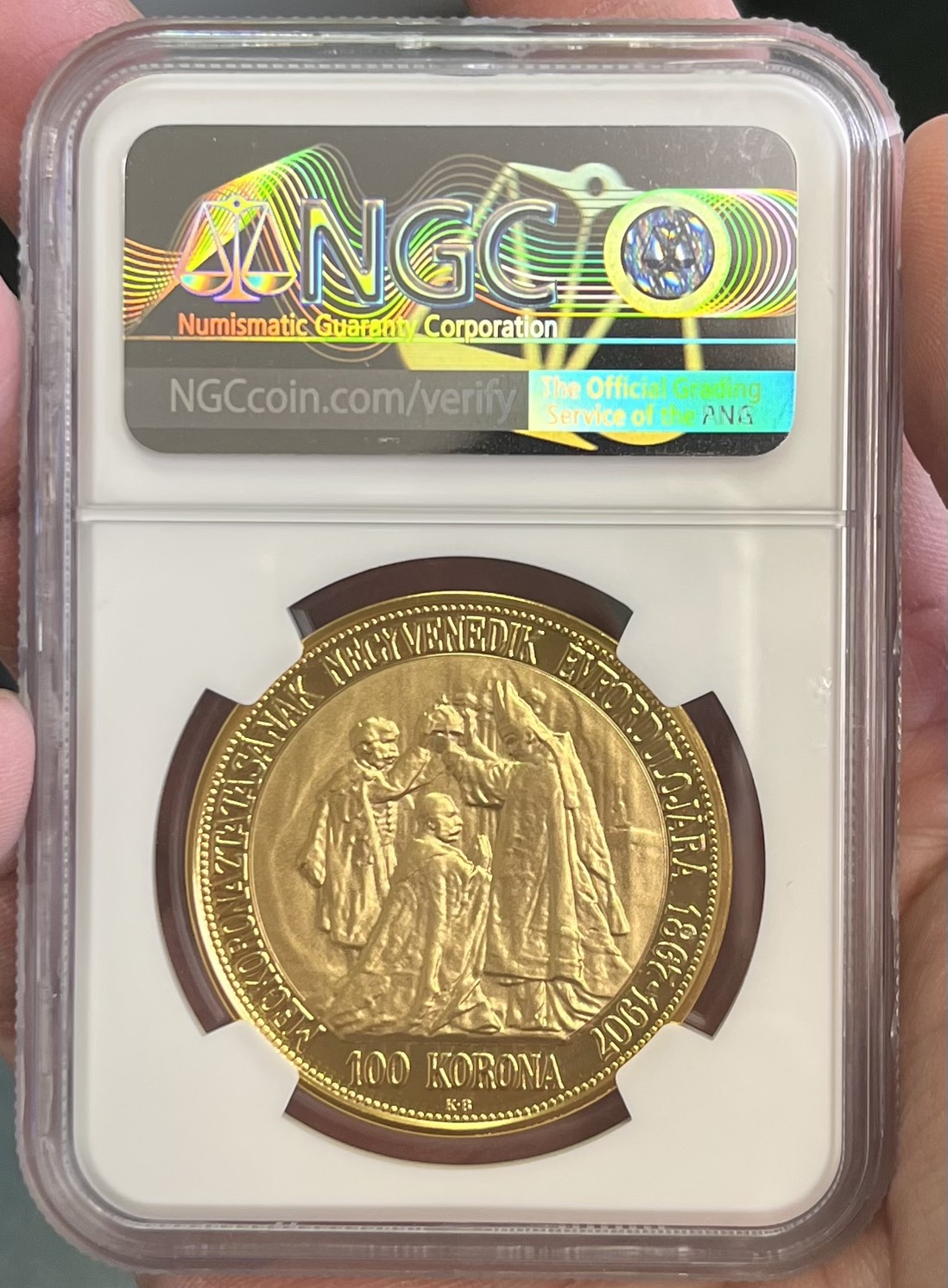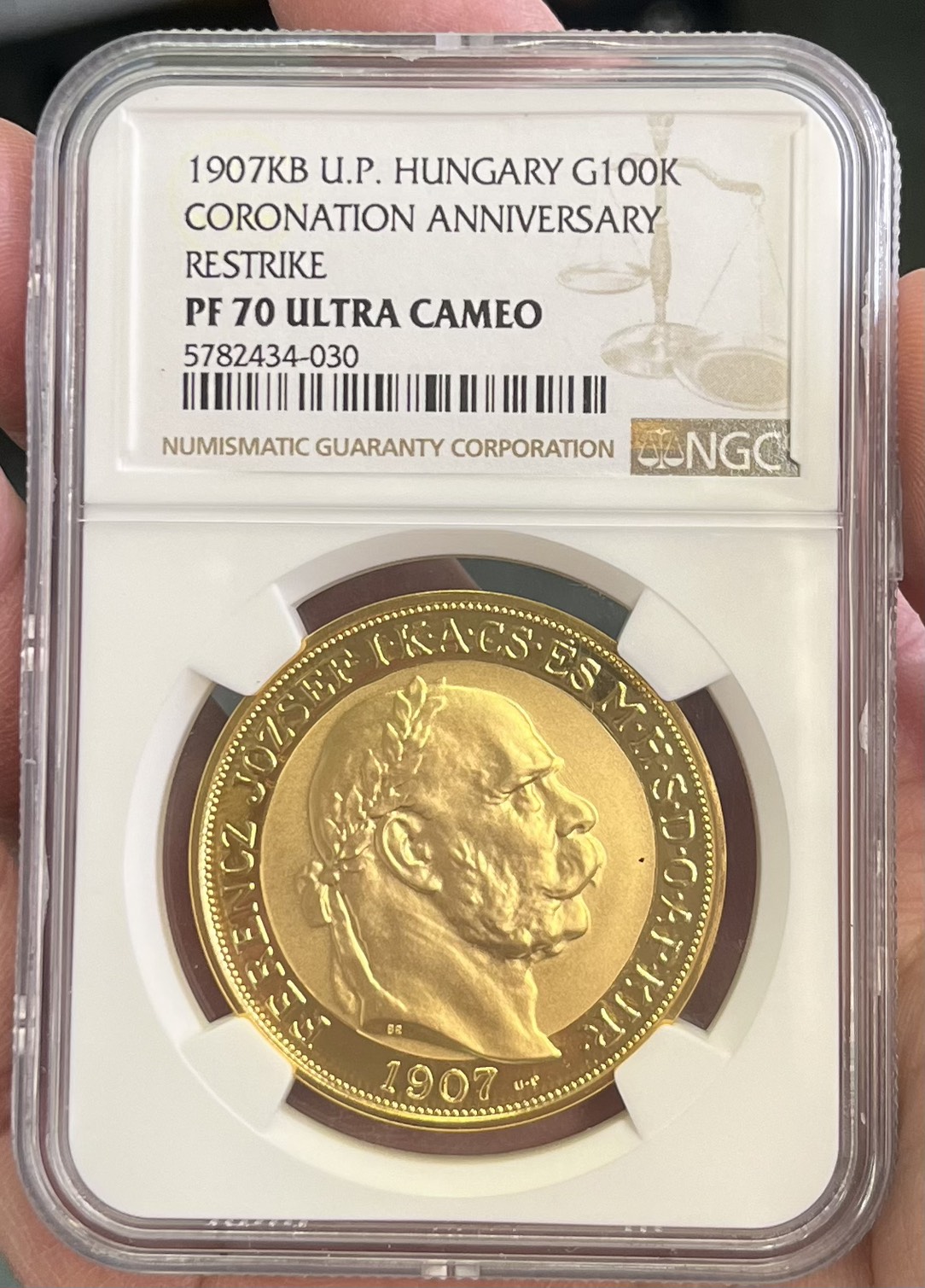 このコインはハンガリー戴冠40周年を記念して発行された金貨のリストライク版です。当店ではオリジナル版も何枚も販売させて頂きましたが、こちらはリストライクのPF70UC、さすがに美しいですね(^^)