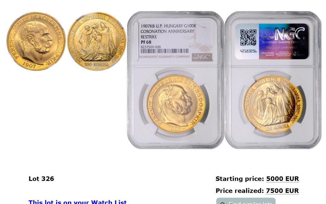 1907年単年発行のヨーゼフ1世戴冠40周年100コロナ金貨、こちらはリストライク版となります。