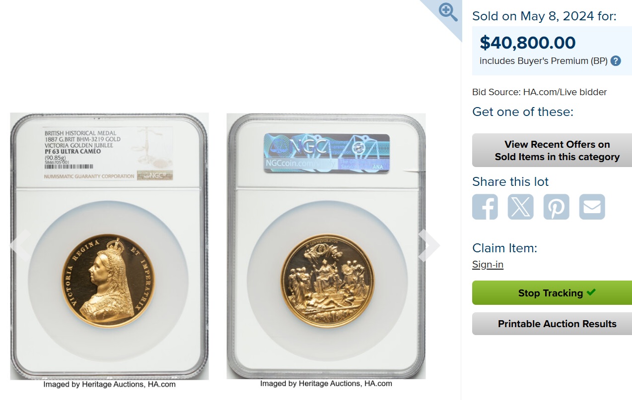 ビクトリア女王の戴冠50周年を記念して、1887年に発行された大型のゴールドメダルになります。通称、ゴールデンジュビリーと呼ばれるこのメダルは近年急激に人気が高まってきており、価格もグッと上がってまいりました!