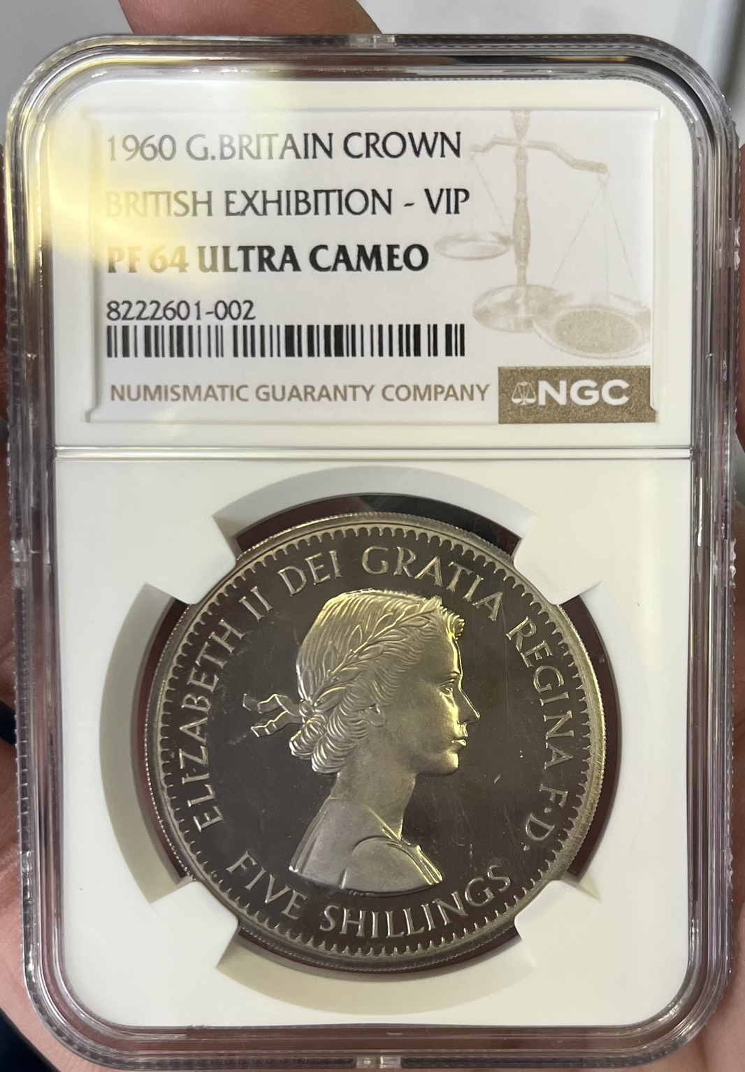 1960年ニューヨークで開催された英国博覧会を記念して発行されたこちらのクラウンは、100万枚以上発行されている通常貨と、30~50枚程度しか発行されていないVIPがございます。