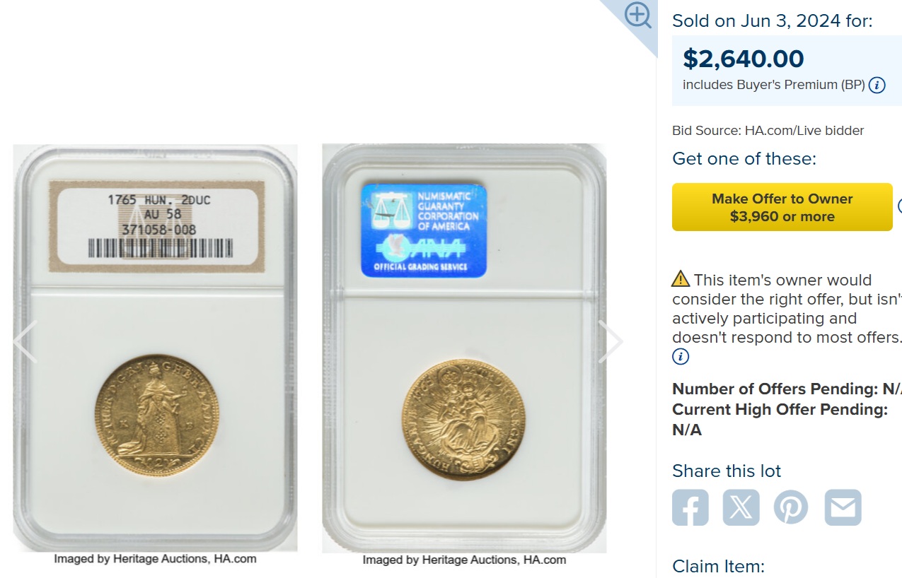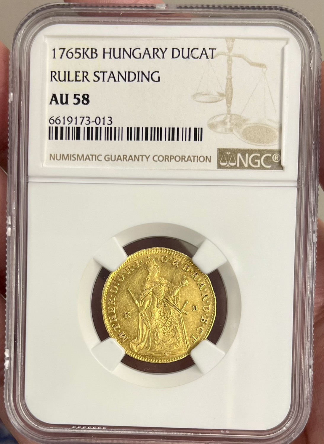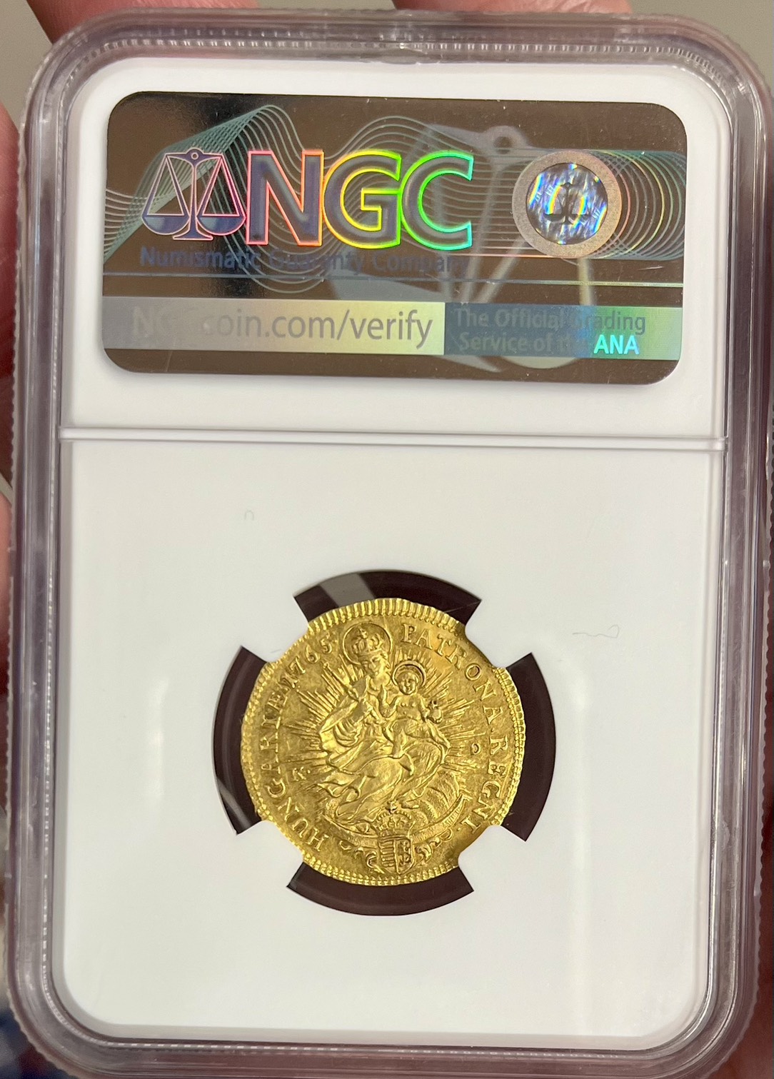 1765年 マリアテレジアのダカット金貨 NGC AU58になります。