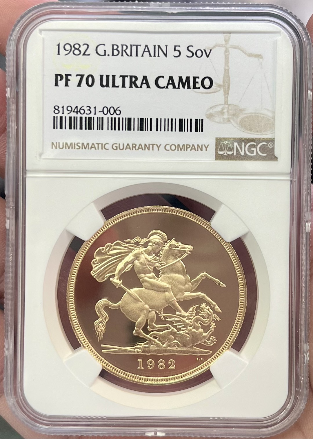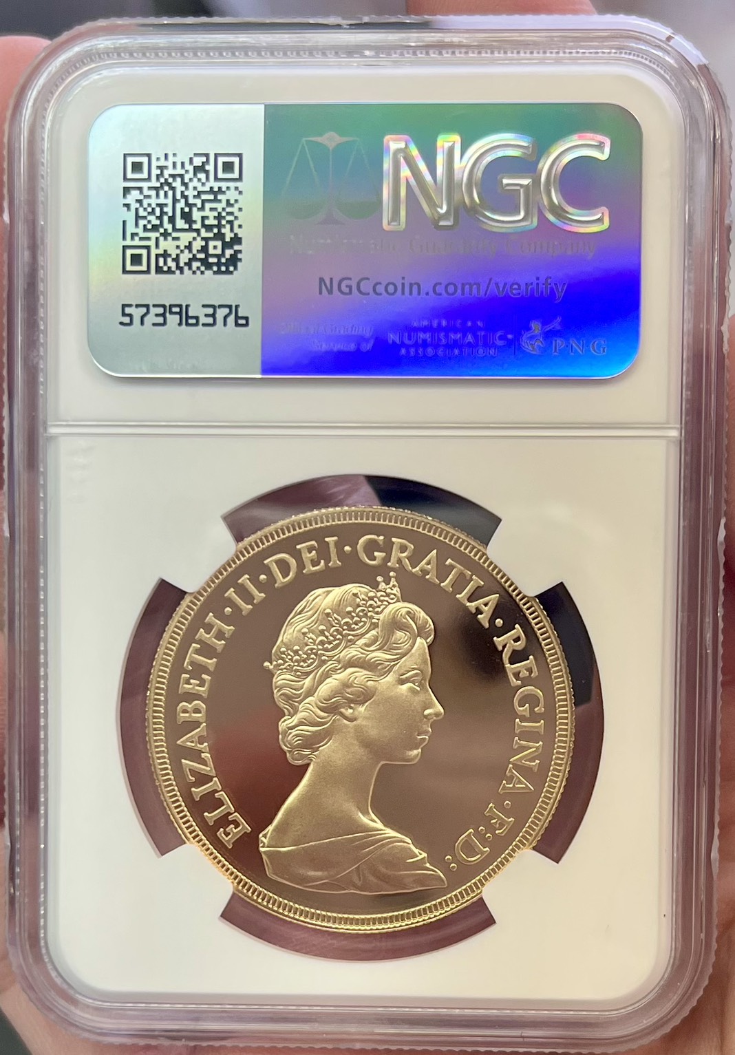 1982年ヤングエリザベス 5ポンド金貨 NGC PF70UCになります。