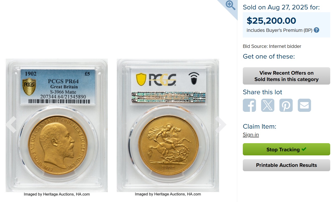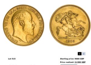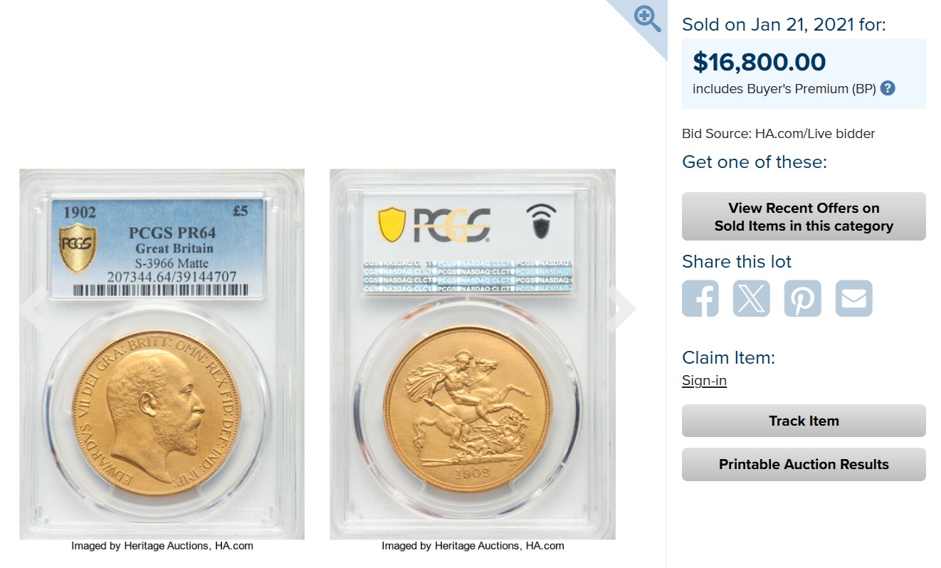 その後も9月にはPF65が560万円で落札され、ハイグレードは完全に一段階価格が上昇したと言えそうです。エドワード7世は5ポンドの中では過小評価されていると私はずっと言ってきましたが、ここに来て今一番勢いのあるコインとなってきております。