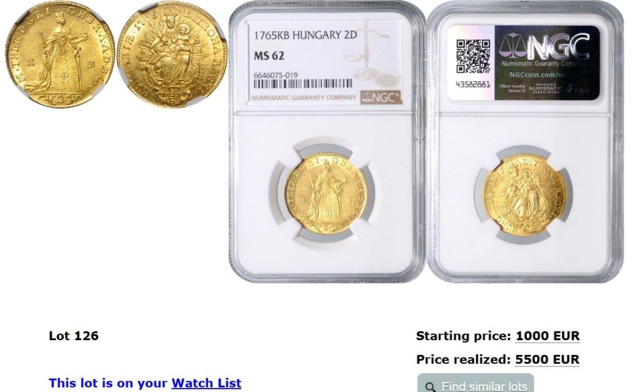1765年 マリアテレジアの2ダカット金貨 ハイグレードのNGC MS61になります。