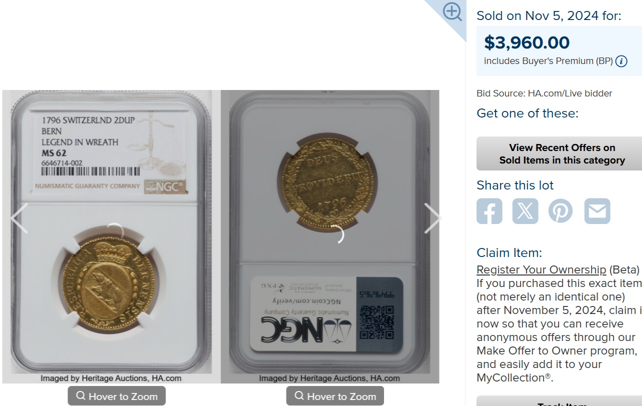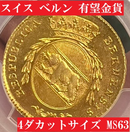 こちらは、1793年スイス ベルン 2ダブロン金貨 MS63のハイグレード品になります。