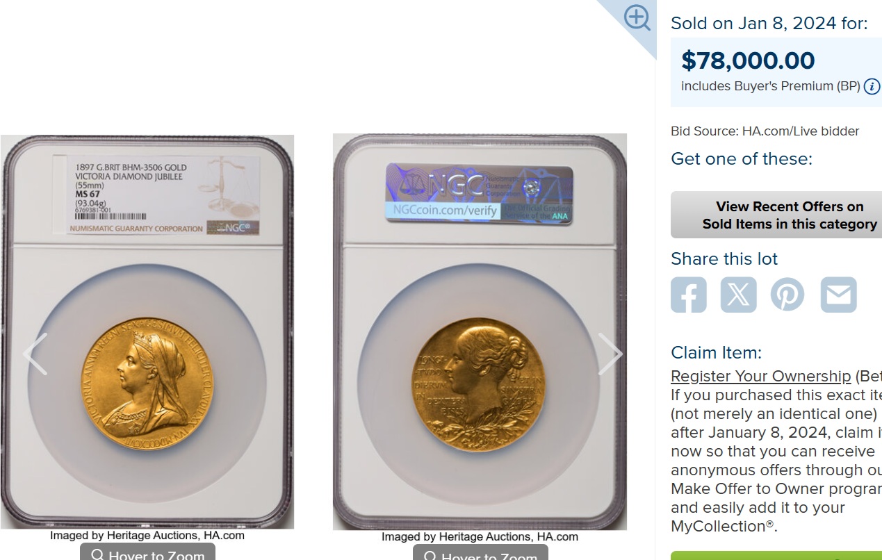 1897年ヴィクトリア女王即位60周年記念大型メダル、今回は何と何と超ハイグレードのNGC MS66になります。