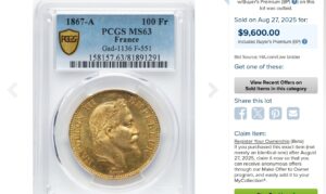 2023年に爆上げしたナポレオン3世100フランですが、その反動で2024年に入ってから少し調整が入りました。ピーク時はMS63で200万円を超える勢いでしたが、今は150~170万くらいでしょうか。