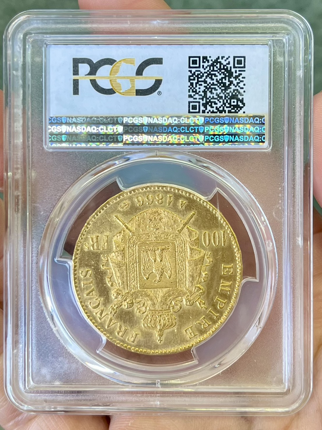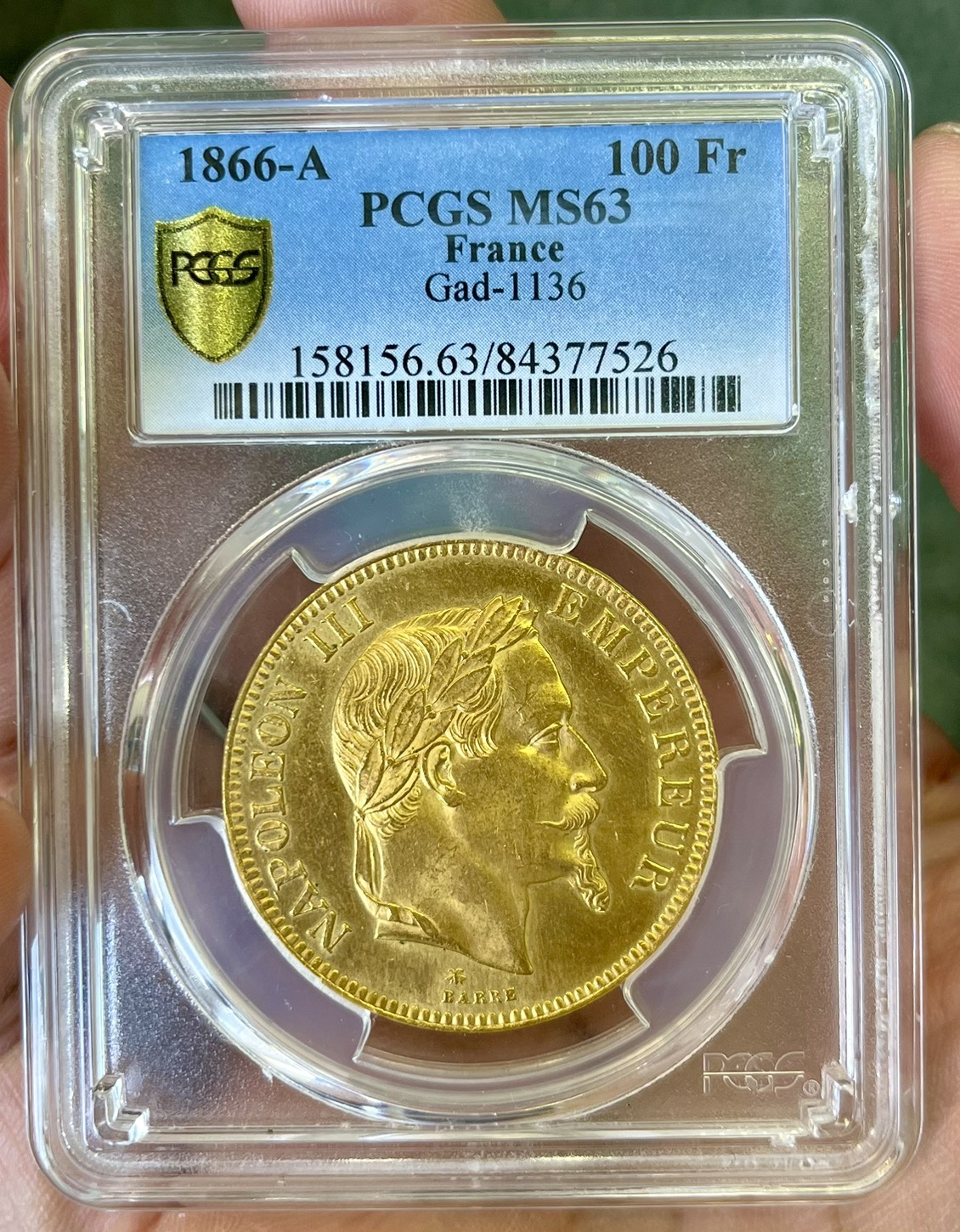 1866年パリ鋳造のナポレオン3世100フラン金貨 MS63になります。
