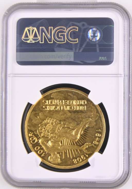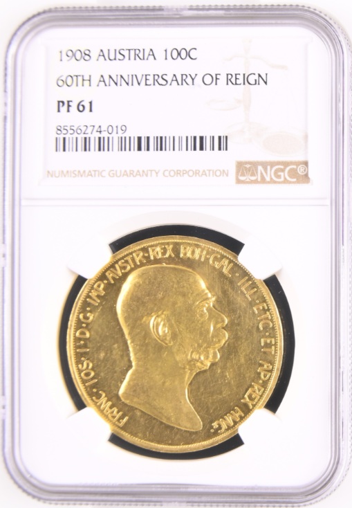 1908年ヨーゼフ1世100コロナ金貨「雲上の女神」です。鏡面仕上げの輝きの素晴らしいPF61鑑定が付いております。
