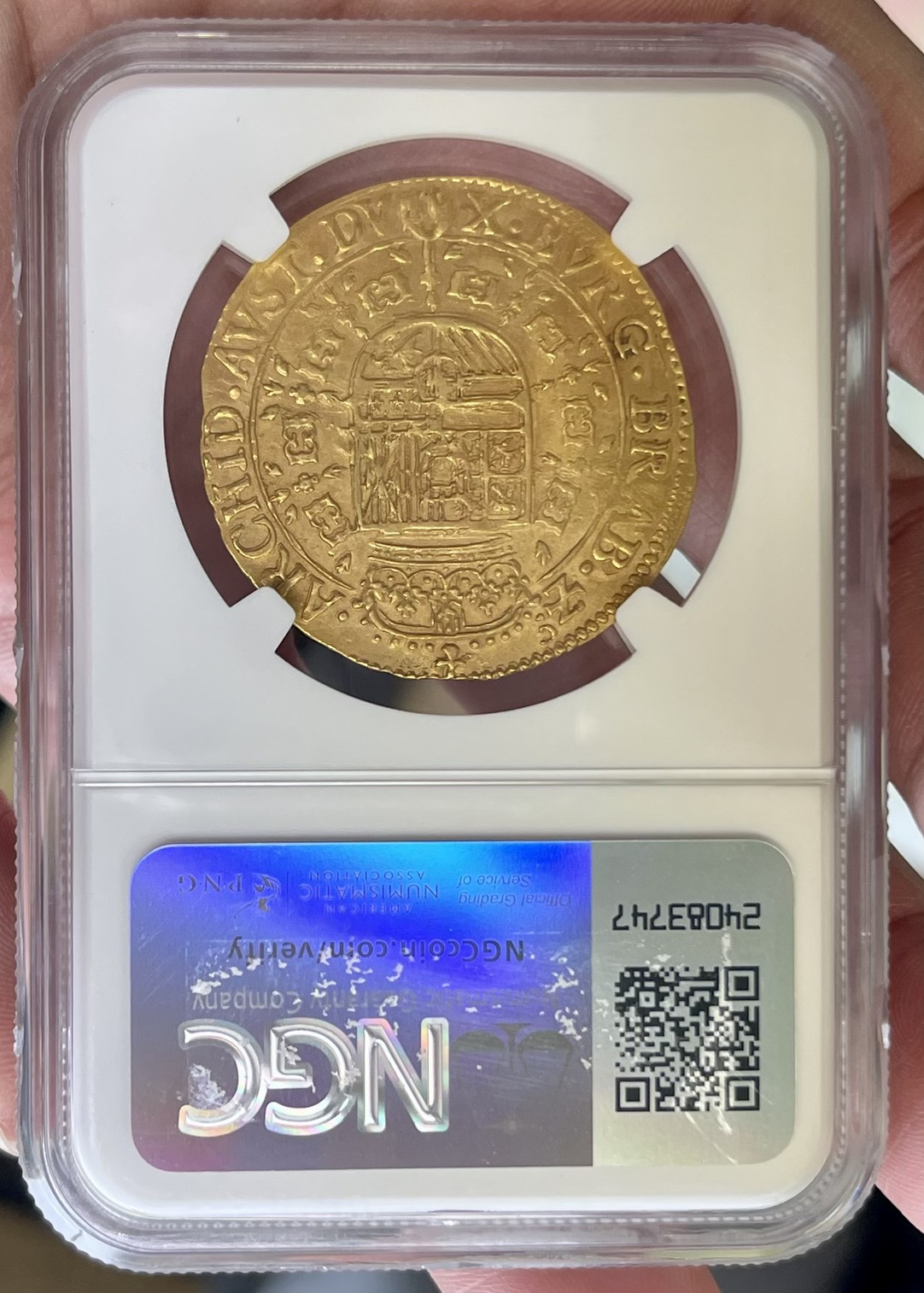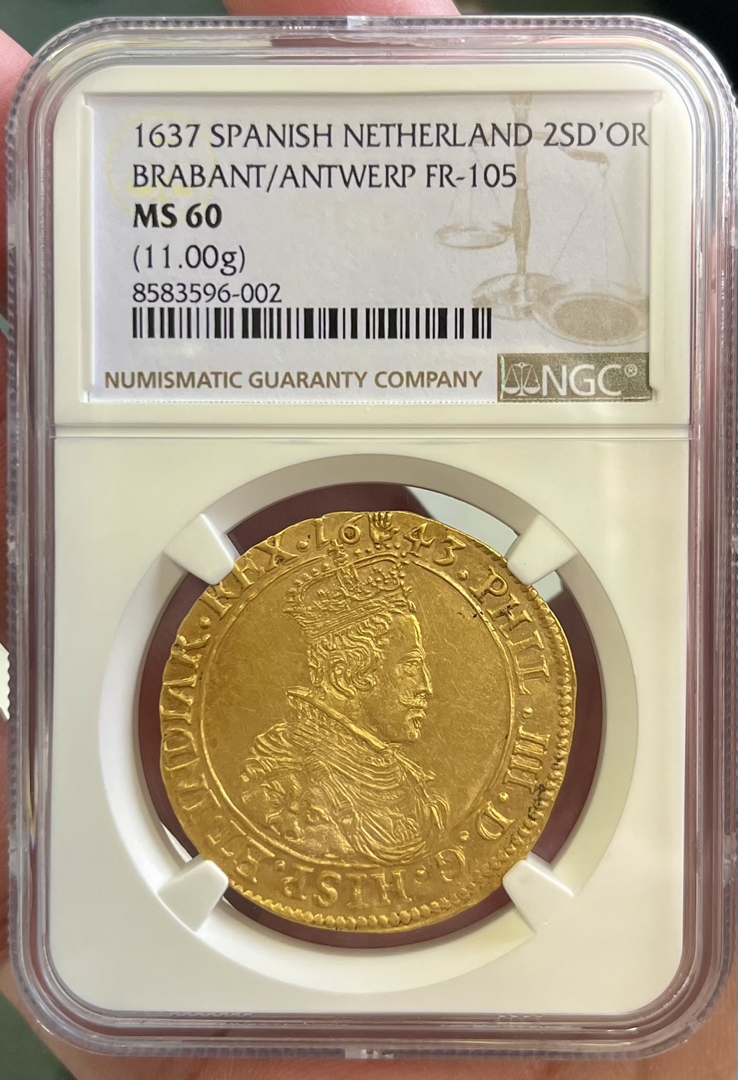 1637年スペイン領ネザーランドフェリペ4世 2ソブリンドール金貨、MS60になります。