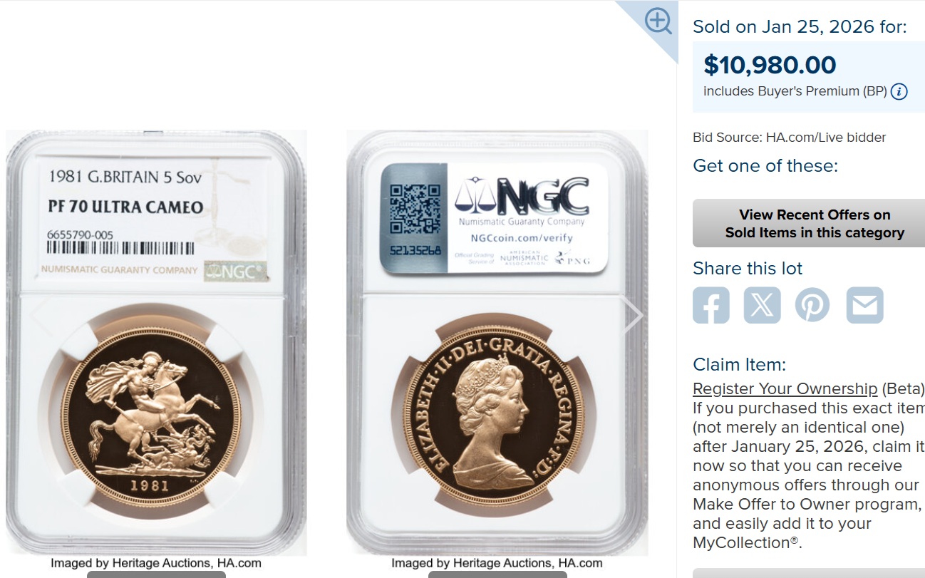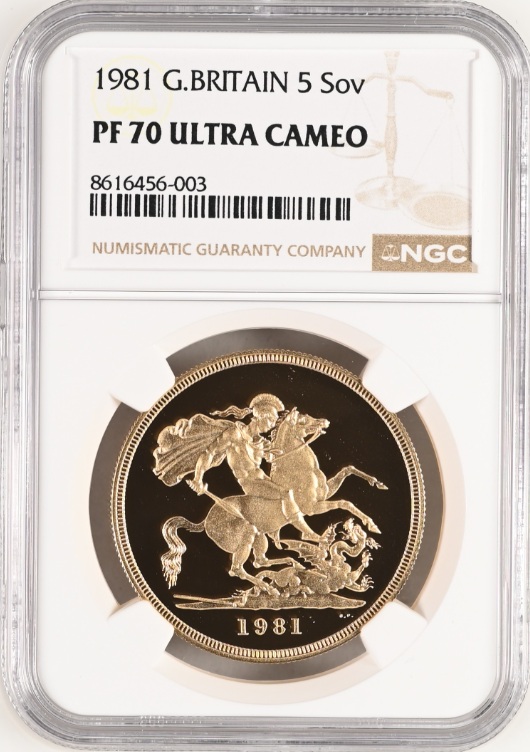 1981年ヤングエリザベス 5ポンド金貨 NGC PF70UCになります。