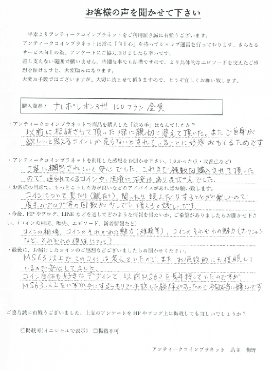 2022年2月 H様 ナポレオン100フラン金貨 MS63