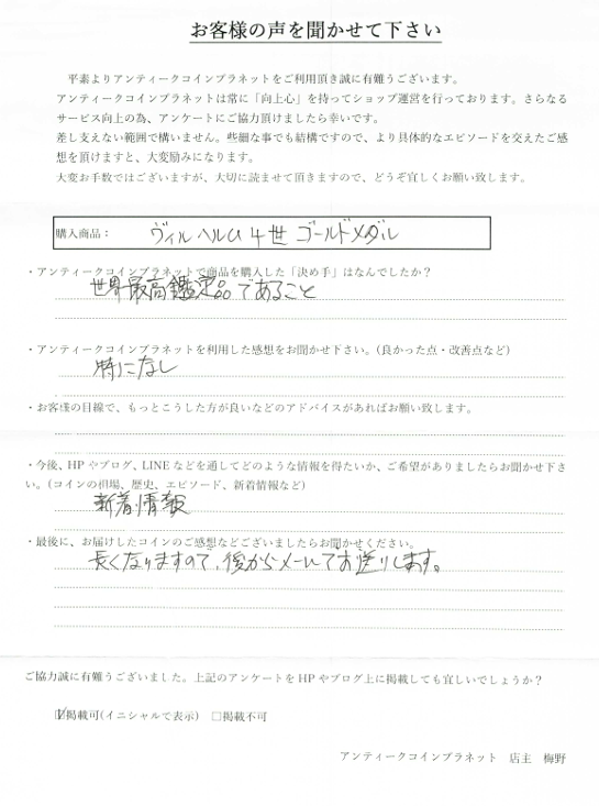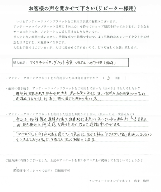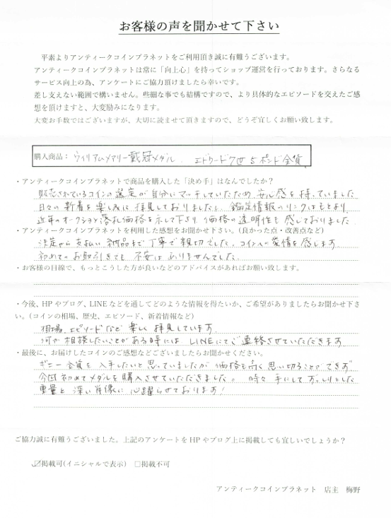 2022年3月 H様(2回目) ヴィクトリアモハール金貨MS61