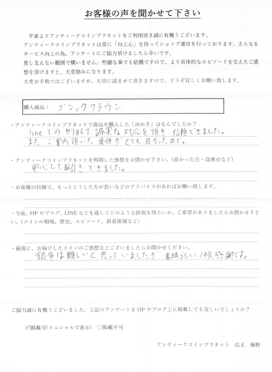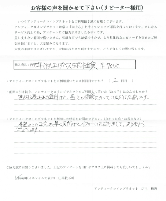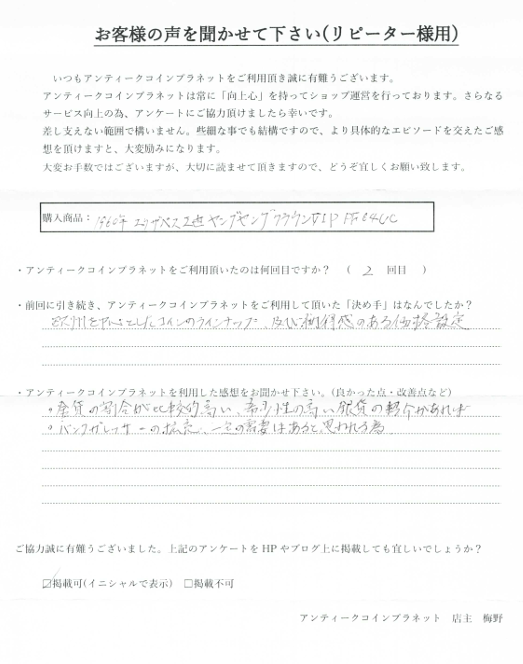 正直、新興ディーラーさんと最初に取引するときは緊張しましたが、店主ブログを拝見すると勉強になりますし共感できる内容も沢山あったので信用できる人だと思ったのが決め手です。余談ですが大手ディーラーさんの中には波動を感じる素晴らしいコインとして裸コインを売っていたりしますがこれを鑑定に出してスラブに入らなくても返金はしませんと書いています。コイン商さんは今が稼ぎ時なのにコイン不足のようで度が過ぎるのではと思うことが度々あります。アンティークコインプラネットさんのブログの内容は真っ当な感じがします。正直者が損をしないように成功することを望んでいます。