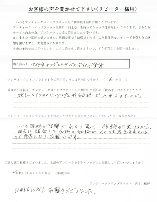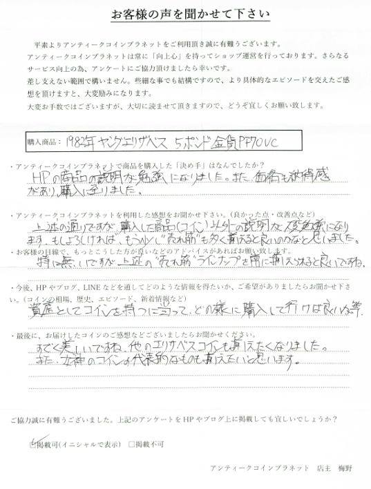 2022年9月 O様 ヤングエリザベス5ポンド金貨