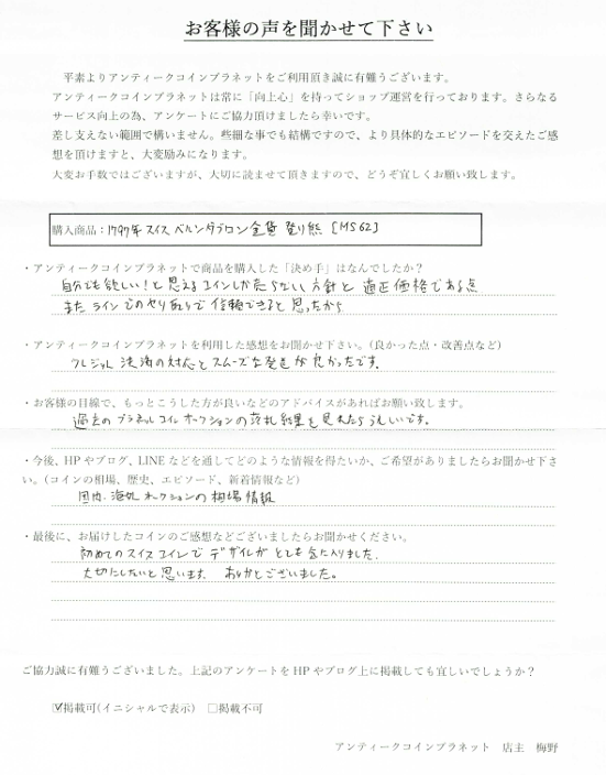 2022年8月 H様 スイスブレネリ金貨